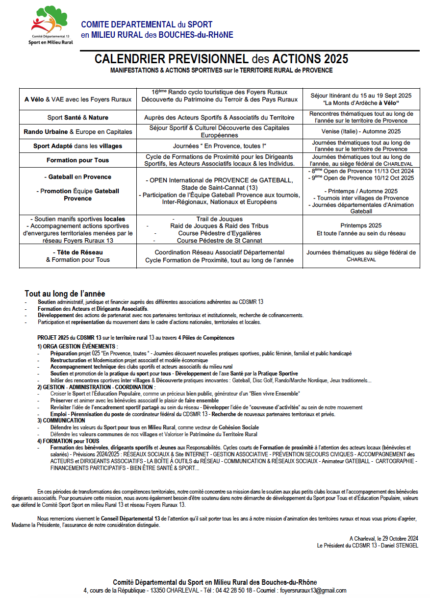 Notre réseau Sport en Milieu Rural des Bouches du Rhône contribue à l’animation et au développement sportif des villages en Provence et valorise la pratique sportive pour Tous, sport santé, sport adapté, jeux sportifs intergénérationnel, jeux traditionnels et activités sportives innovantes…