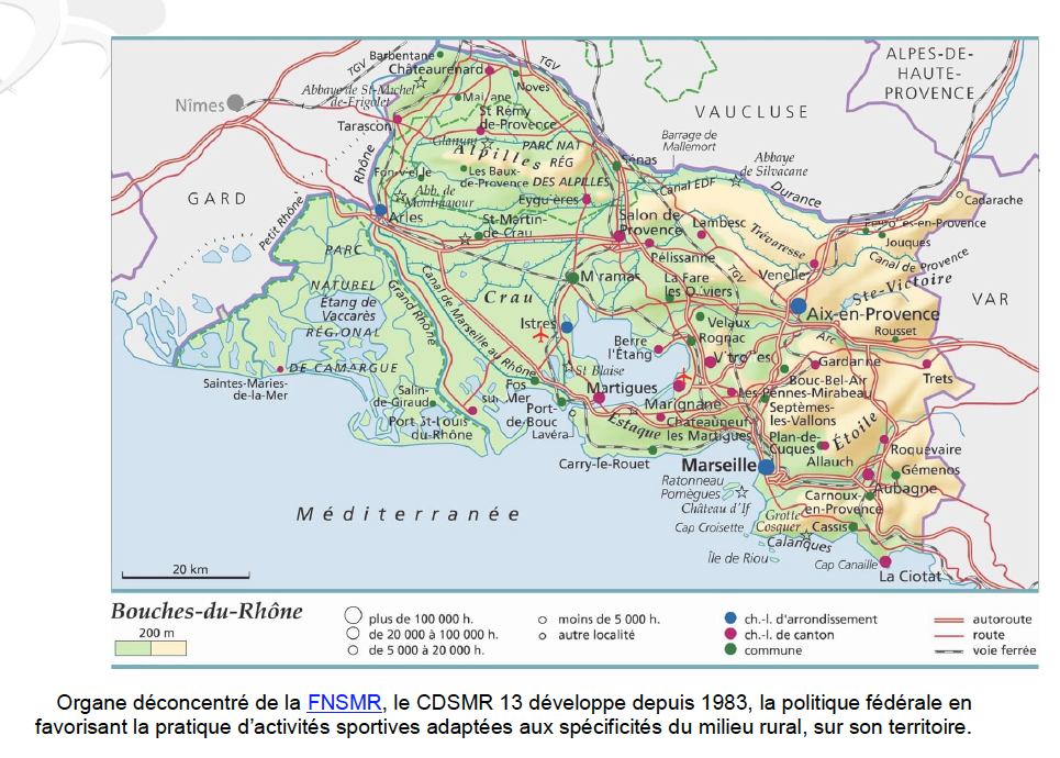 Organe déconcentré de la FNSMR, le CDSMR 13 développe depuis 1983, la politique fédérale en favorisant la pratique d’activités sportives adaptées aux spécificités du milieu rural, sur le territoire des Bouches du Rhône.