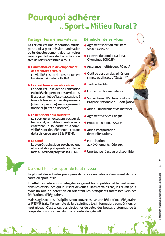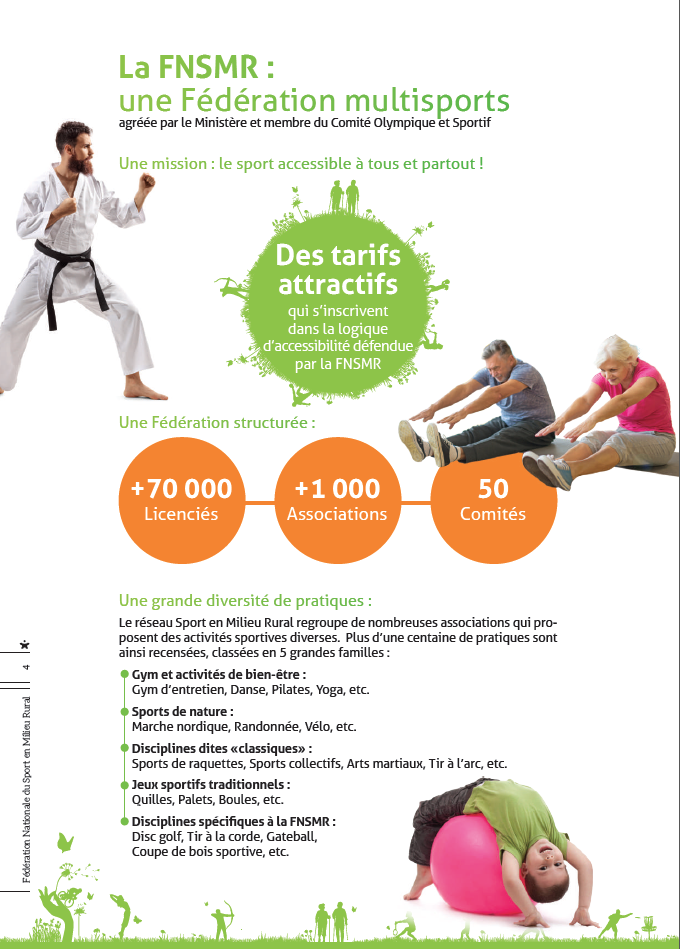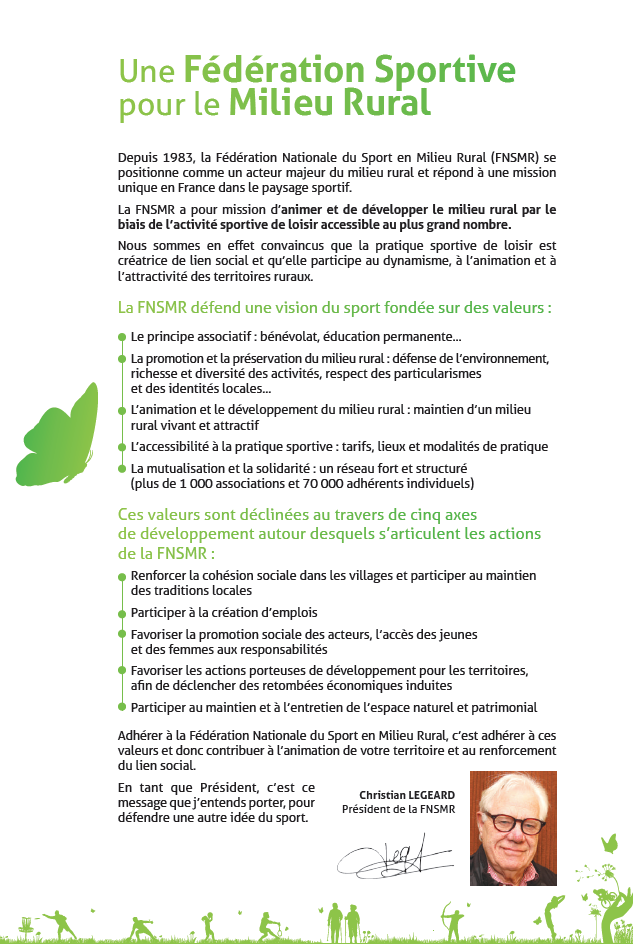 La FNSMR, fédération multisports, créée en 1983, agréée par le Ministère des Sports et membre du Comité National Olympique et Sportif Français. Elle a pour but de favoriser la pratique d’activités sportives adaptées aux spécificités de milieu rural. Elle participe ainsi à l’animation, mais également au développement des territoires ruraux à la fois sur le plan sociétal et sur le plan économique.